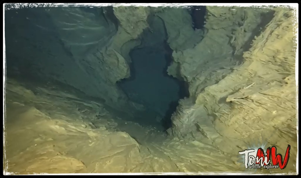 Aunque llevamos botellas pequeñas de aluminio, s40 de 5,7 litros, la única forma de entrar fue con una de ellas por delante y la otra en lateral, por un sifón de unos 80 centímetros de ancho y con el pecho pegado a un fondo de arcilla suelta en la que era fácil meter el brazo hasta el codo, a tan solo 3 metros de la entrada del sifón, esta estrecha galería horizontal, gira casi 180 grados con un peralte de arcilla, para luego descender de forma muy marcada, por lo menos hasta donde llegaba mi brazo. Este paso ya me fue imposible de franquear, palpando con las manos para adivinar sus formas y tamaño, antes de salir empujándome con las manos en las paredes y el fondo, marqué la línea e intenté leer la brújula pero fue imposible ver nada en esas condiciones, una vez fuera el profundímetro había registrado una profundidad máxima de 2,3 metros y unos agradables 12°C de temperatura del agua.