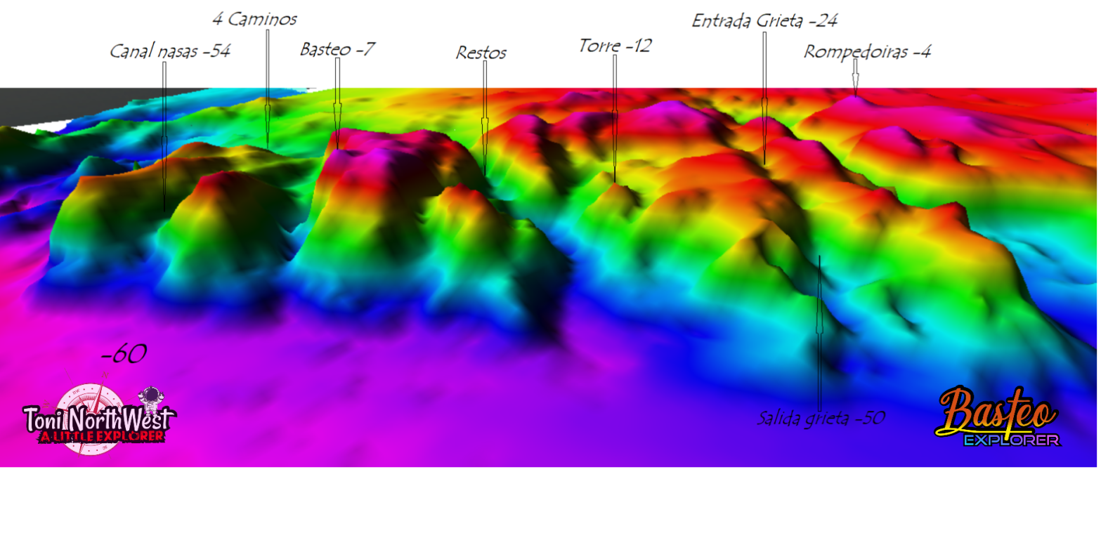 La siguiente zona (hay tres zonas que están muy bien delimitadas por marcados canales, amplios y con fondos de arena) Nos deparó una agradable sorpresa, y es que buscando la parte alta del bajo para empezar a explorar, fondeamos en los 16 metros de profundidad, pero justo en esa zona el bajo tiene forma de embudo hasta los 24 metros, en donde hay una pequeña entrada a una grieta, que si bien no está del todo cerrada por la parte de arriba, una de las paredes está extraplomada sobre la otra, dejando muy poca apertura y haciendo imposible el ascenso directo a la superficie, por lo que solo hay una entrada y una salida, la grieta desciende hasta los 50 metros, saliendo entre dos enormes paredes separadas por solo un metro de distancia. En el canal que separa esta zona del Basteo hay algunos restos de cables de acero y por la zona quedan unos pocos restos de una gabarra, pero que nosotros aun no hemos localizado. Casi en el final de este canal, a modo de centinela, existe una estrecha torre de piedra, vertical y algo separada del resto de la piedra, su parte más alta llega a los 12 metros.