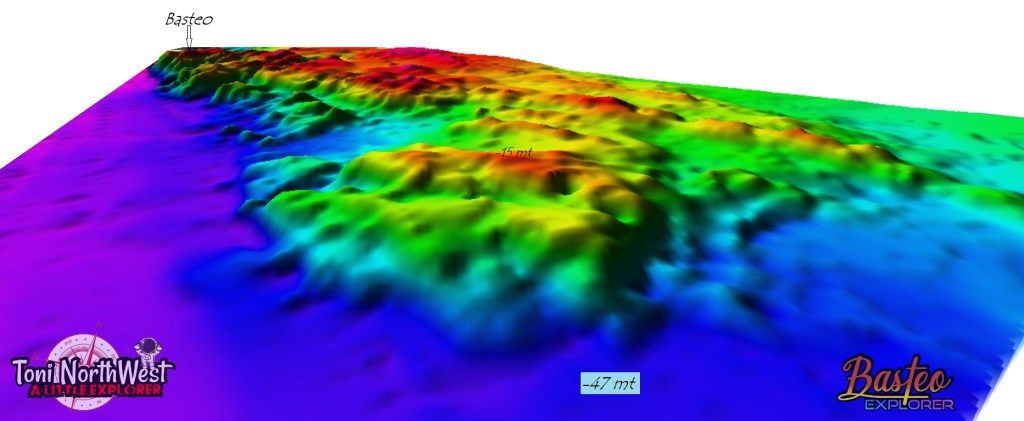 El Basteo en si es un bajo situado al noroeste de las islas de San Pedro, en la Coruña y es sin duda una de las mejores inmersiones de su costa, un enorme bajo que se alza vertical desde fondos de 50 metros en la parte noreste, la mayor pared de toda la zona es sin duda la del propio Basteo, donde se puede fondear entre los 7 y los 9 metros, para descender casi al instante hasta los 50, quizás por ello es la mas conocida y buceada por lo que no explicaré esta parte del bajo, pero toda la zona en si depara muchas sorpresas para el que decida explorar este grupo de bajos y si lo hace con un torpedo submarino, la diversión esta garantizada.