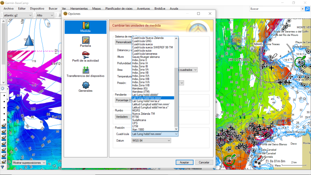 Diferentes sistemas de coordenadas de un programa Garmin.