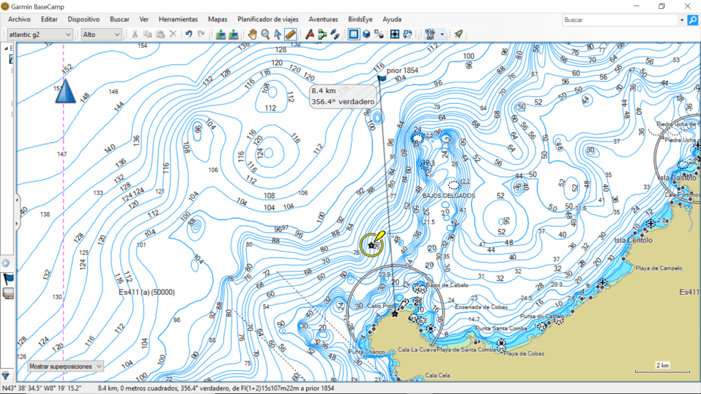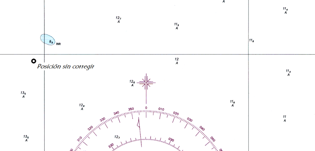 En el datum Postdam o europeo hay mas diferencia con el actual Wgs84 que en el datum Madrid, según la leyenda 0,06 minutos de latitud y 0,09 de longitud, lo que en distancia son 170 metros, si volvemos a un caso practico y por ejemplo situamos la posición del pecio del Viking, en la ría de Ares sin aplicar las correcciones indicadas en la propia carta, nos encontramos con una diferencia incluso algo mayor, 0,063 minutos en latitud y 0,104 minutos en la longitud, por lo que sucede lo siguiente: